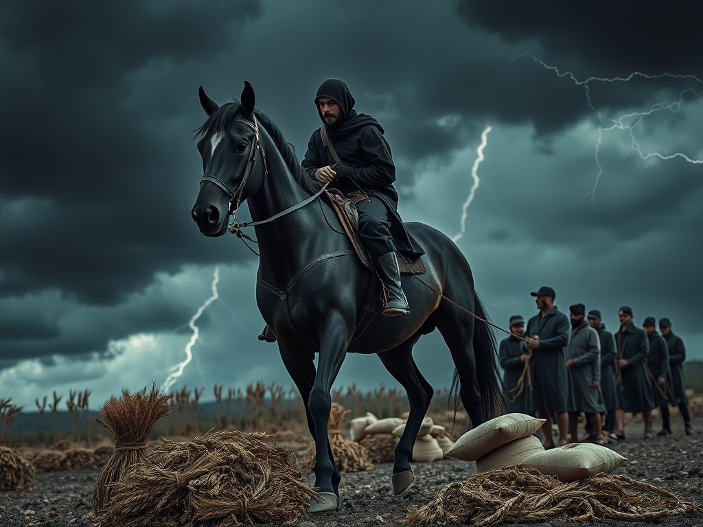 When the Lamb* opened the third seal*, I heard the third living creature* say, “Come and see.” So, I looked and saw a black* horse and sitting on it, a rider* with the yoke of servitude* in his hands. Then, I heard a voice speaking in the midst of the four living creatures say, “A measure of grain will cost one denarius*, and a measure of barley will cost three denarius* and you will suffer without oil and wine.”